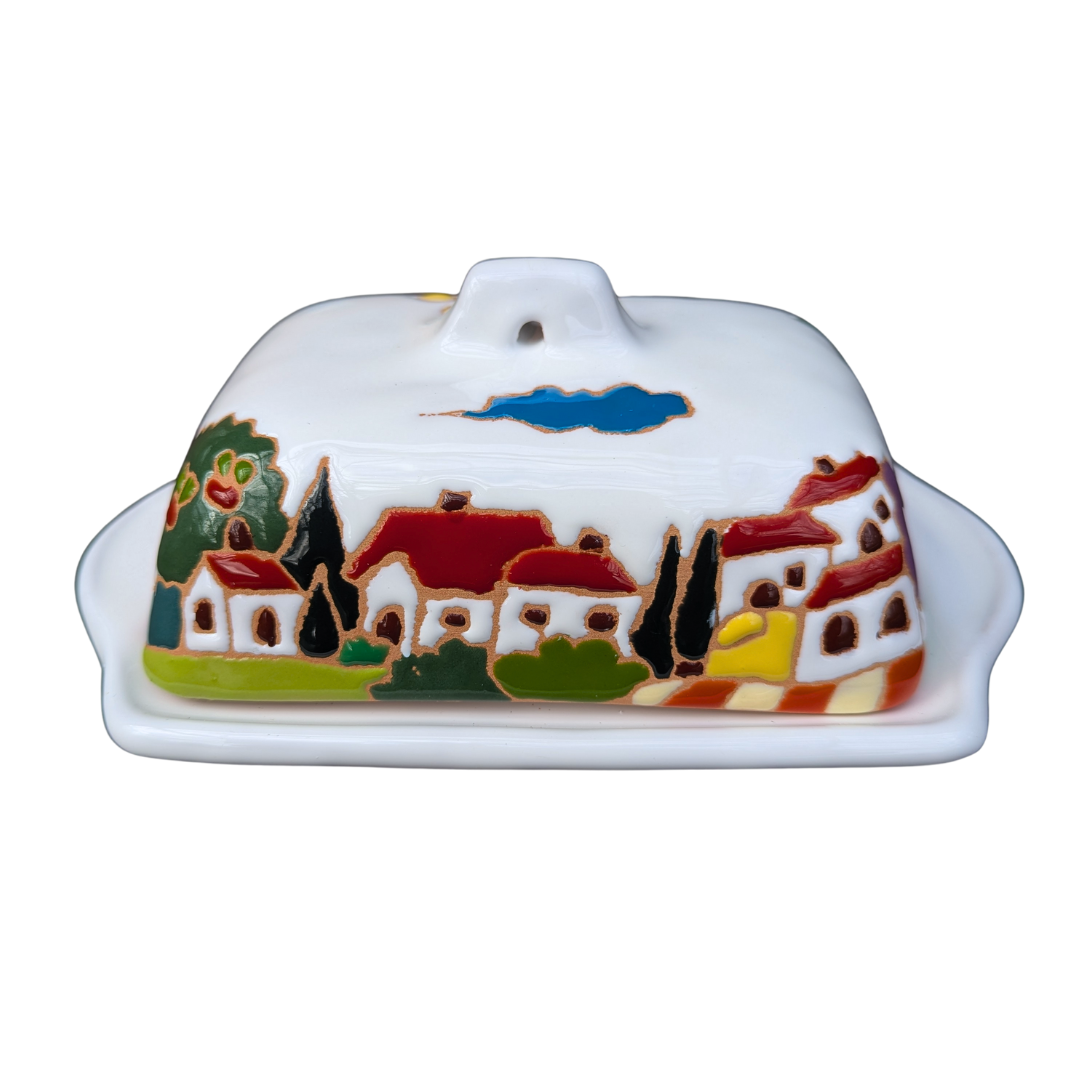Keep your butter fresh while adding a splash of Tuscan charm to your table with this delightful butter dish. A little Tuscan village scene dances around the lid and decorates the base as well.